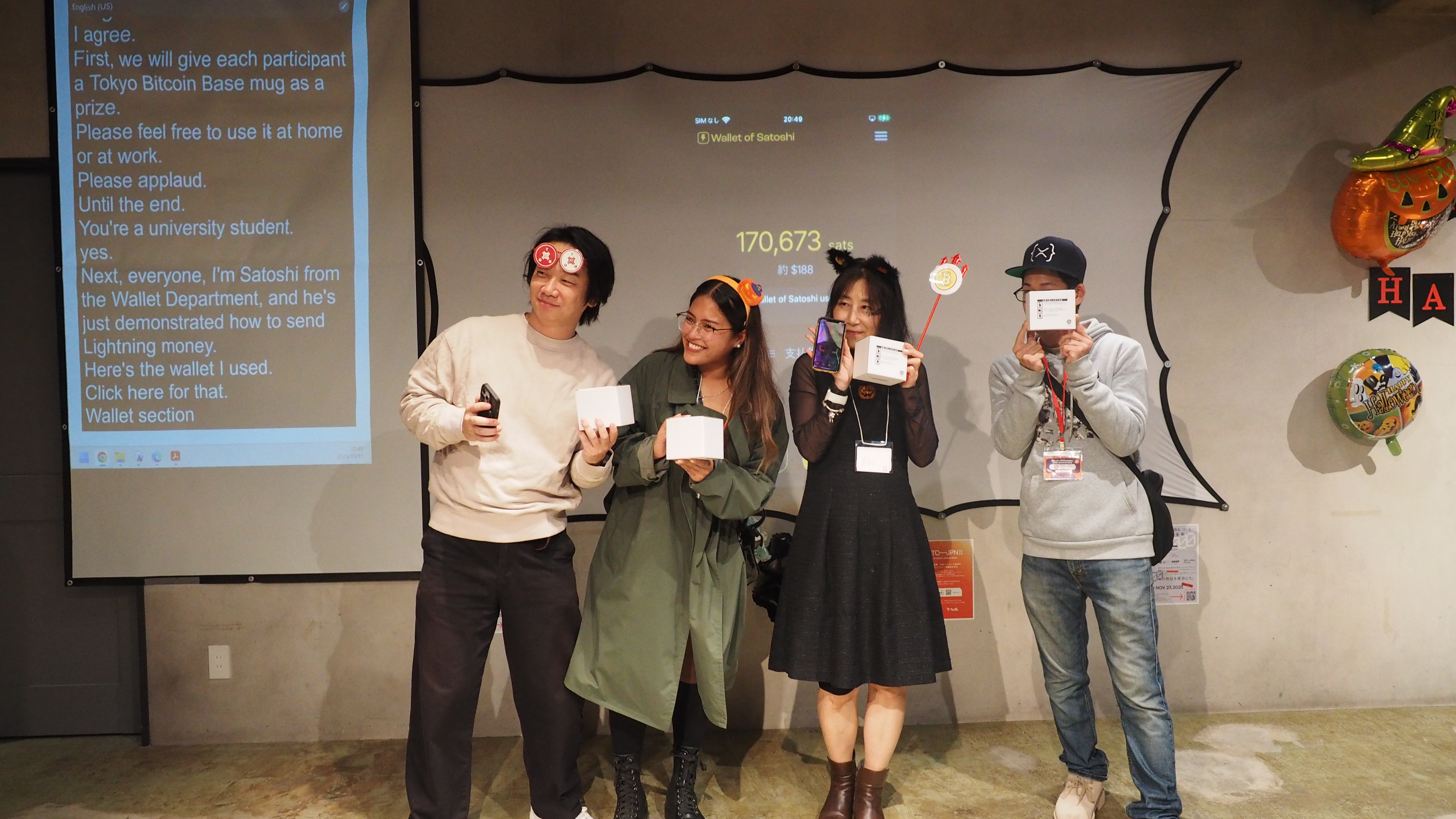 優勝チームへの景品は、3,000円分のsatoshiでした。各自のスマホのビットコインウォレットアプリの Wallet of Satoshi (WoS)に、ビットコイン・ライトニングネットワークによって3,000円分のsatoshiが送付されました。4,5秒程度で高速で送金が完了される様子も、スライドに映し出されていました。